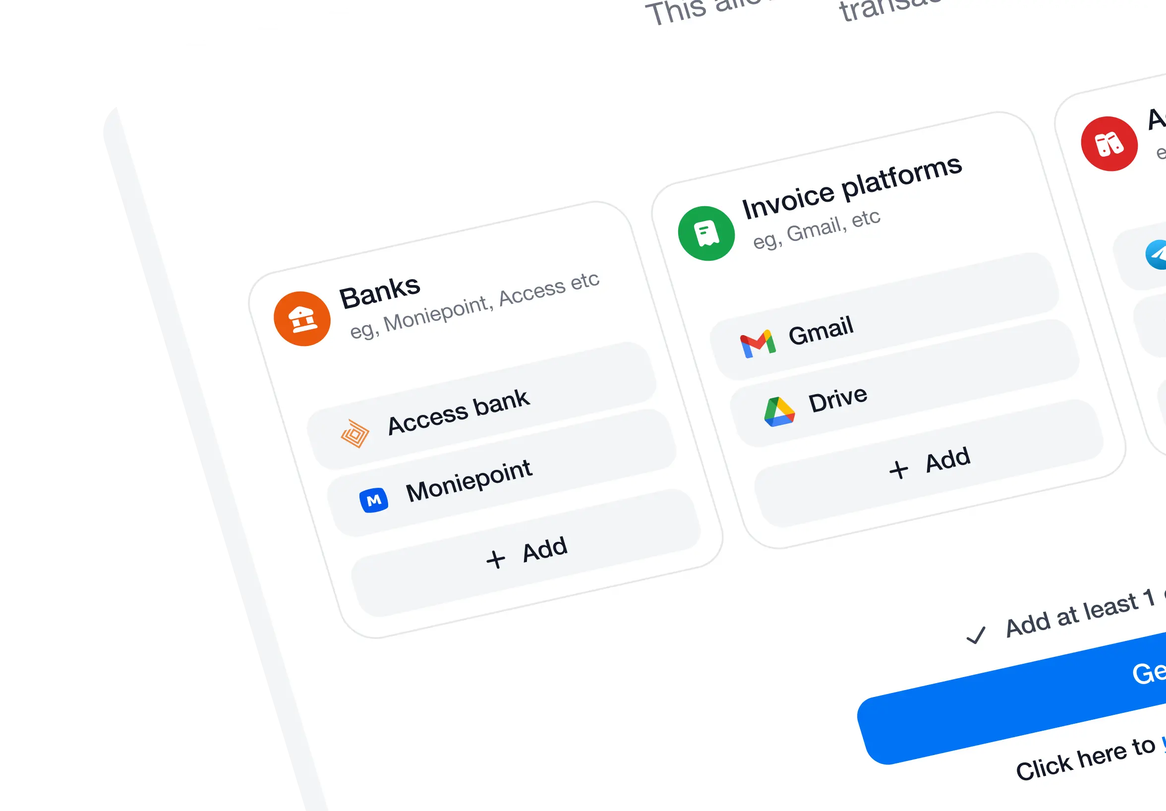 Connect everything—banks, POS, fintechs, accounting apps like QuickBooks or Zoho.